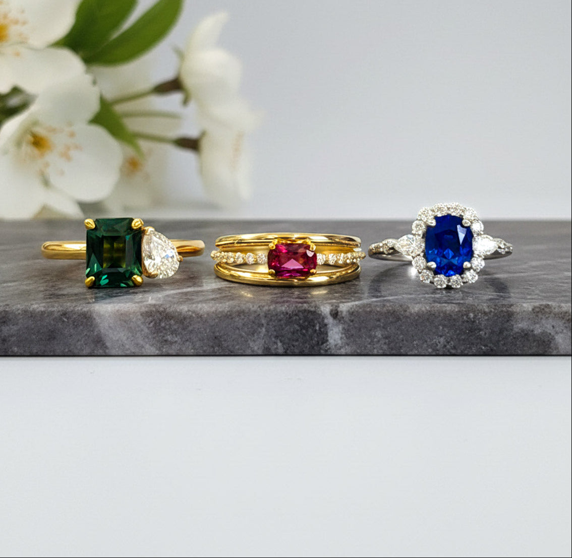 Discover ethically sourced emeralds, rubies, sapphires, alexandrites and diamonds.